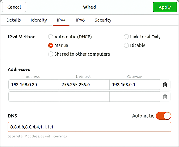 2. Go to the IPv4 tab and set the IPv4 Method to Manual. Then, configure the following information: