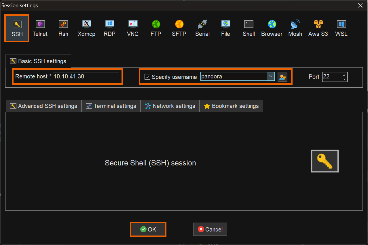 Then click OK to create the SSH session.