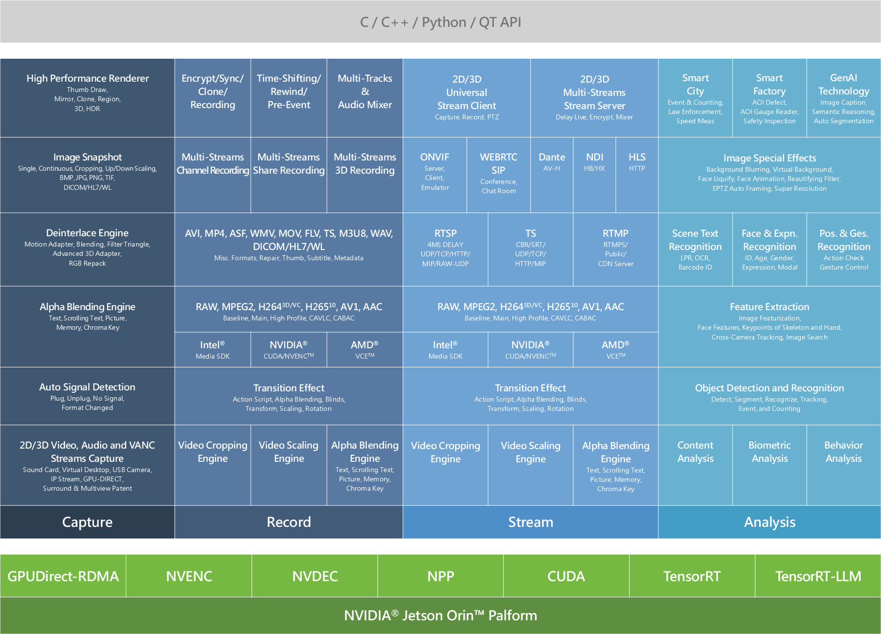 - Powerful hardware platform and low-level acceleration: Shifting your gaze to the very bottom of the block diagram, you will find that the entire architecture is deeply rooted in the powerful NVIDIA® Jetson Orin™ Platform. The SDK deeply integrates NVIDIA's core acceleration technologies, including GPUDirect/RDMA, NVENC/NVDEC, and CUDA computing, and even extends to the AI end with TensorRT and TensorRT-LLM. This ensures that performance is optimally utilized in every step, from video input to AI intelligent analysis.