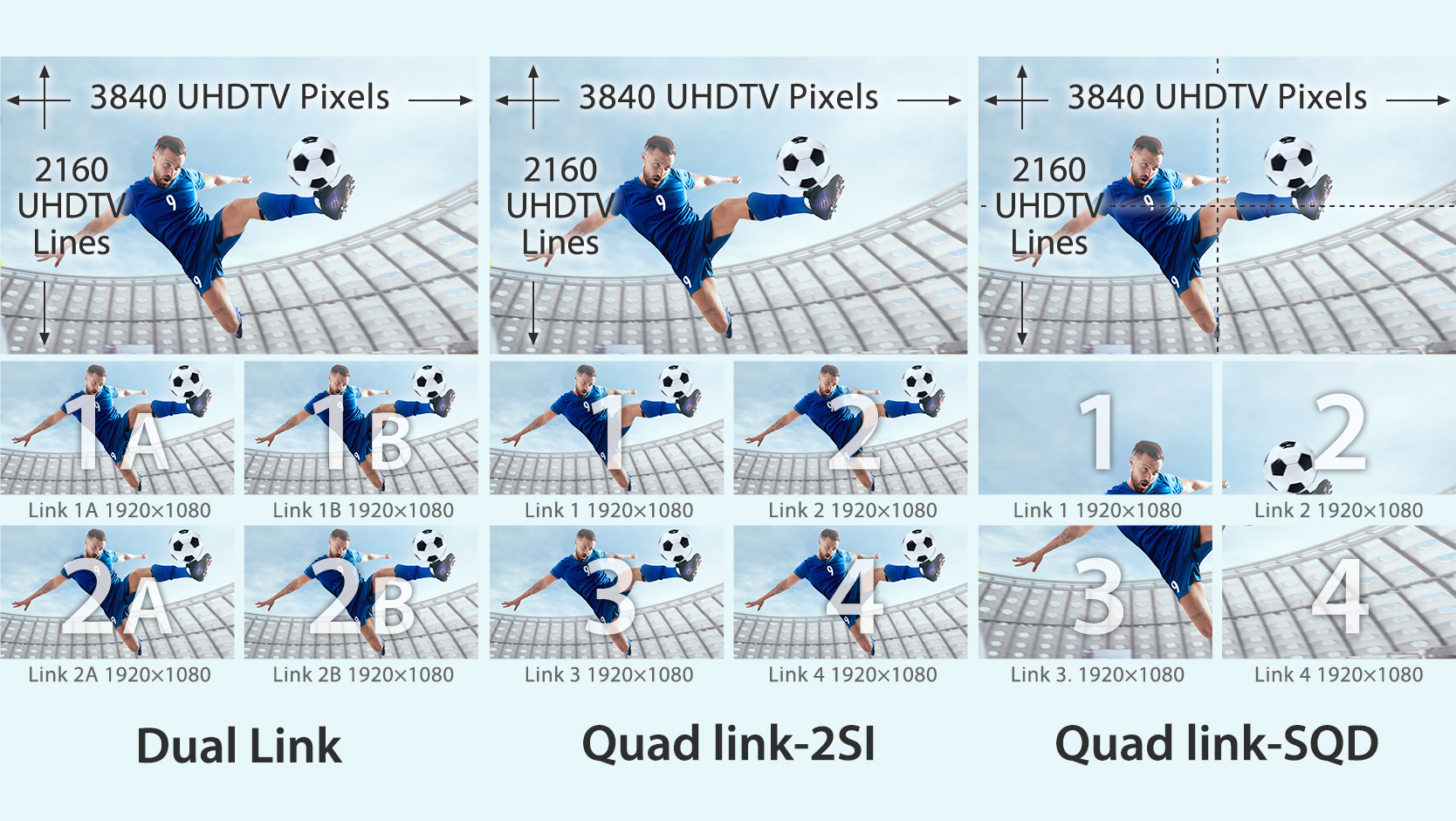 Under single channel of SDI video capturing, supports 4k resolution by single link/ dual link/ quad link. Moreover, 2SI and QSD mode are both supported as well in Quad-link 3G-SDI.